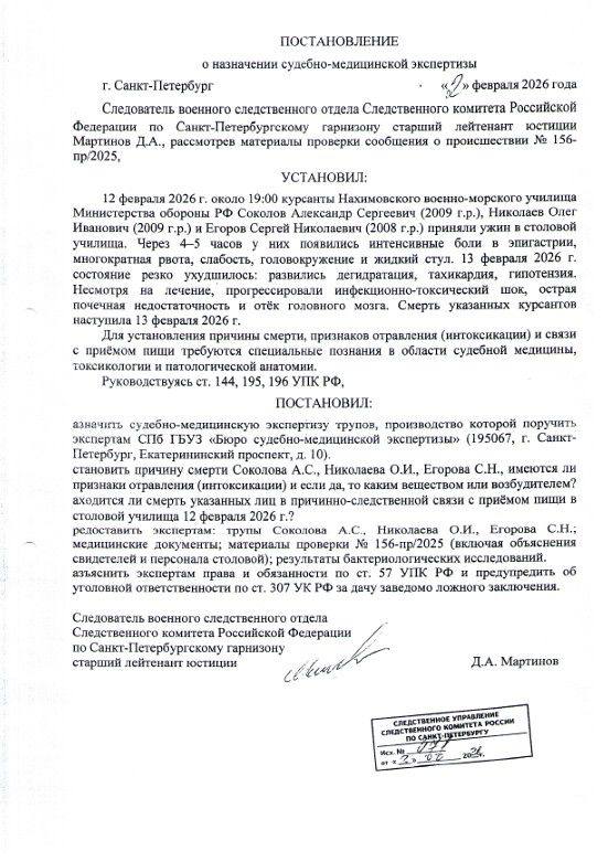 Военный следователь старший лейтенант юстиции Мартинов Д.А. уже 14 февраля вынес постановление о назначении судебно-медицинской экспертизы трупов. Однако по состоянию на 8 апреля 2026 года ответ экспертов в адрес следствия так и не поступил. Родители справедливо спрашивают: почему экспертиза, которая должна установить точную причину отравления и связь с питанием в столовой, до сих пор не готова?