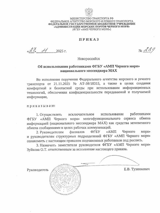 Приказ от 27 ноября 2025 года № 224, подписанный руководителем Е.В. Тузинкевичем, предписывает работникам морской администрации Черного моря перейти на MAX для обеспечения "конфиденциальности и безопасности" коммуникаций. Документ ссылается на поручение федерального агентства и подчеркивает необходимость ознакомления сотрудников под роспись. Аналогичный подход применен и в Министерстве обороны. Военнослужащим флотов предписано устанавливать приложение для оперативного обмена информацией, включая координаты и планы перемещений. "Это не рекомендация, а прямой приказ, – рассказал источник из Черноморского флота. – Отказ грозит дисциплинарными мерами".