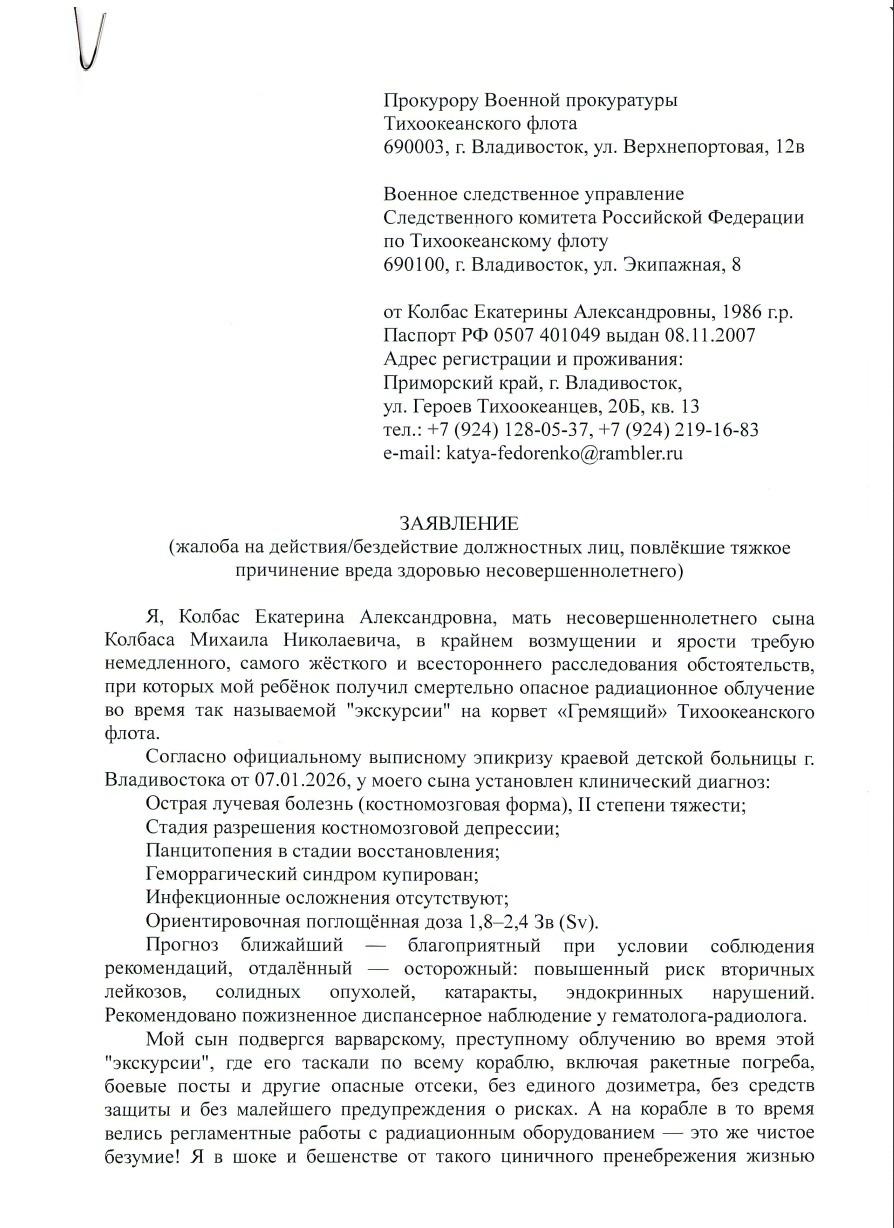 Мать Михаила обратилась в военную прокуратуру и следственный комитет с требованием провести тщательное расследование обстоятельств экскурсии и уровня радиационной безопасности на момент посещения корабля.