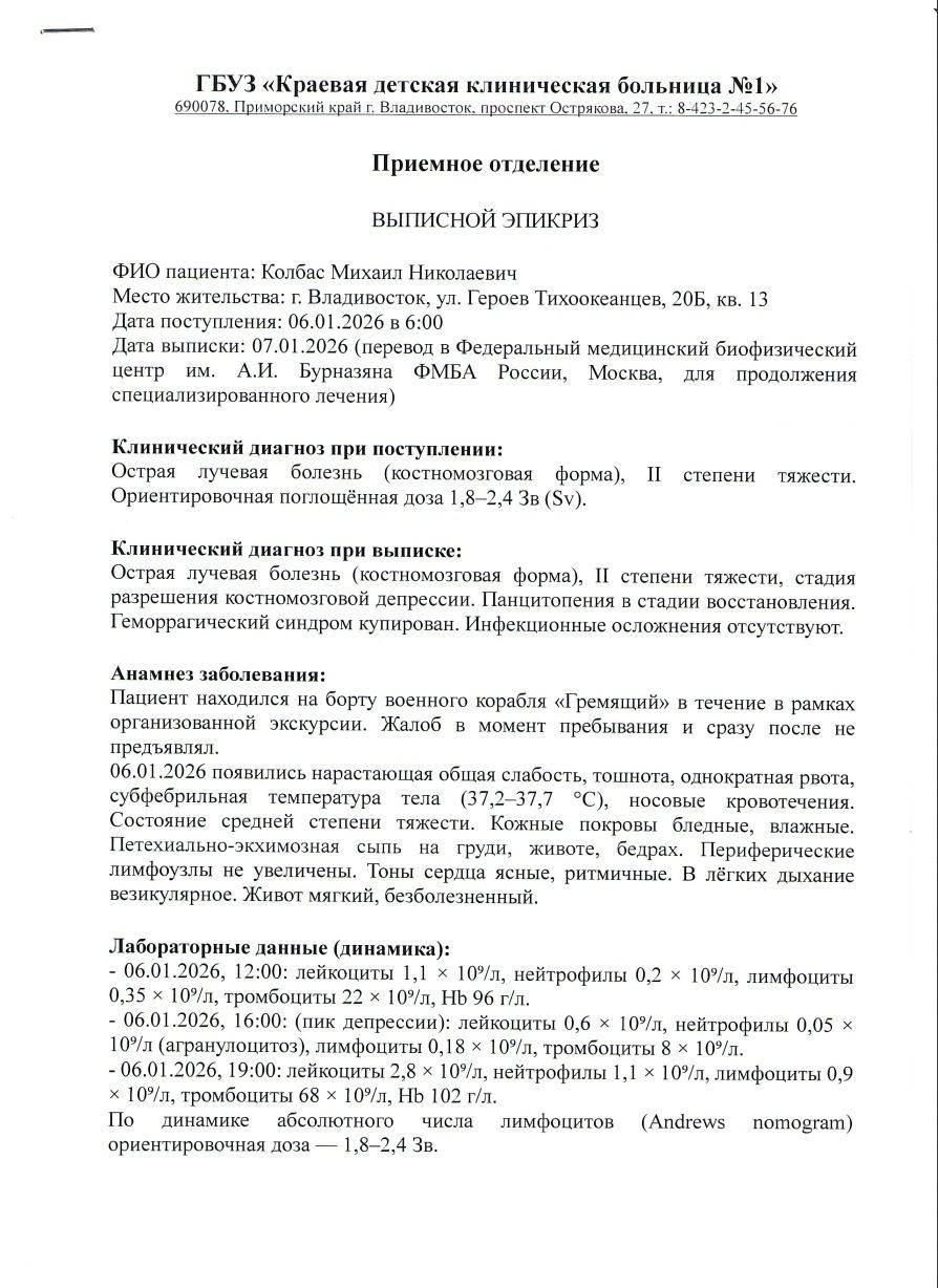 Сейчас Михаил находится в краевой детской больнице Владивостока. По предварительным данным анализа крови (лимфоциты упали до критически низкого уровня — 0,6 × 10⁹/л), у него развивается клиническая картина, характерная для острой лучевой болезни 1–2 степени (доза ориентировочно 1,8–2,4 Зв). Врачи не исключают, что мальчик получил облучение в одном из отсеков, где во время подготовки к пусковым испытаниям или при замене элементов радиолокационной/радиационной защиты могли быть временно ослаблены меры биологической защиты.