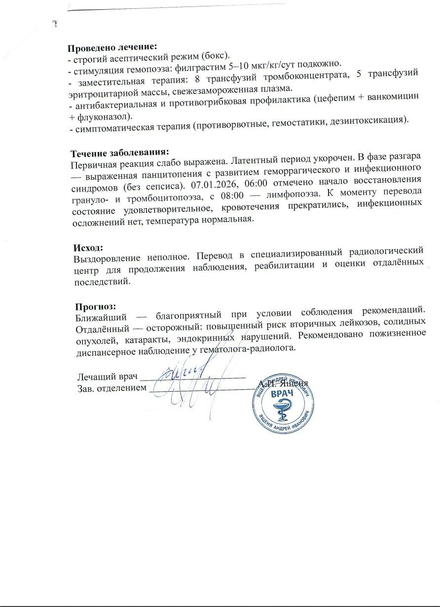 Сейчас Михаилу проводят интенсивную поддерживающую терапию, переливание компонентов крови и курс стимуляторов кроветворения. Прогноз врачей осторожный: при благоприятном течении острая фаза может закончиться через 3–4 недели, но долгосрочные последствия (риск лейкемии, катаракты, нарушений иммунитета) сохраняются на всю жизнь.