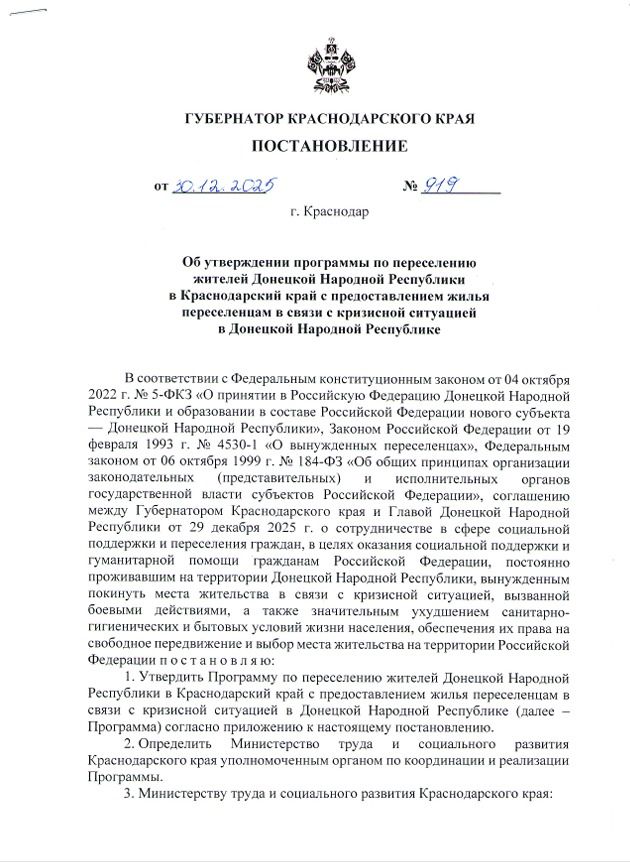 Постановление опирается на федеральный закон о принятии ДНР в состав России, закон о вынужденных переселенцах и соглашение между Краснодарским краем и главой ДНР от 29 декабря 2025 года.