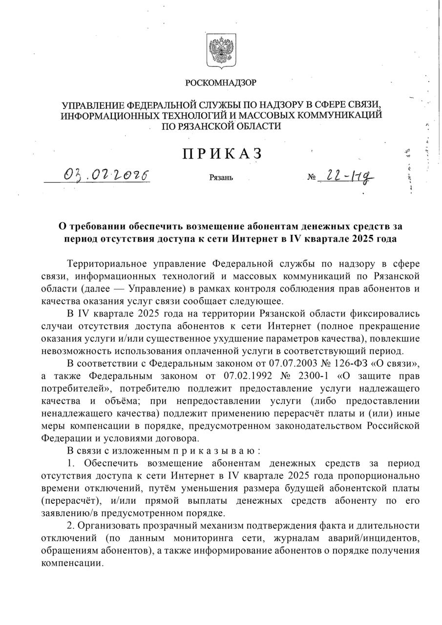 Согласно приказу Территориальное управление Федеральной службы по надзору в сфере связи, информационных технологий и массовых коммуникаций по Рязанской области (далее — Управление) в рамках контроля соблюдения прав абонентов и качества оказания услуг связи сообщает следующее.
