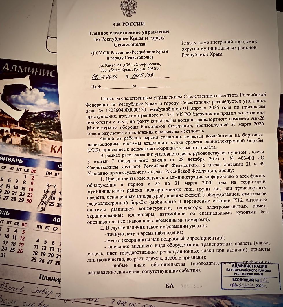 Одновременно следователи направили официальные запросы главам всех муниципальных районов Крыма. В документе, подписанном старшим следователем по особо важным делам, прямо указывается: с 25 по 31 марта 2026 года на территории района могли находиться мобильные или переносные станции РЭБ. Администрациям предписано собрать информацию от сотрудников и жителей и передать её следствию.