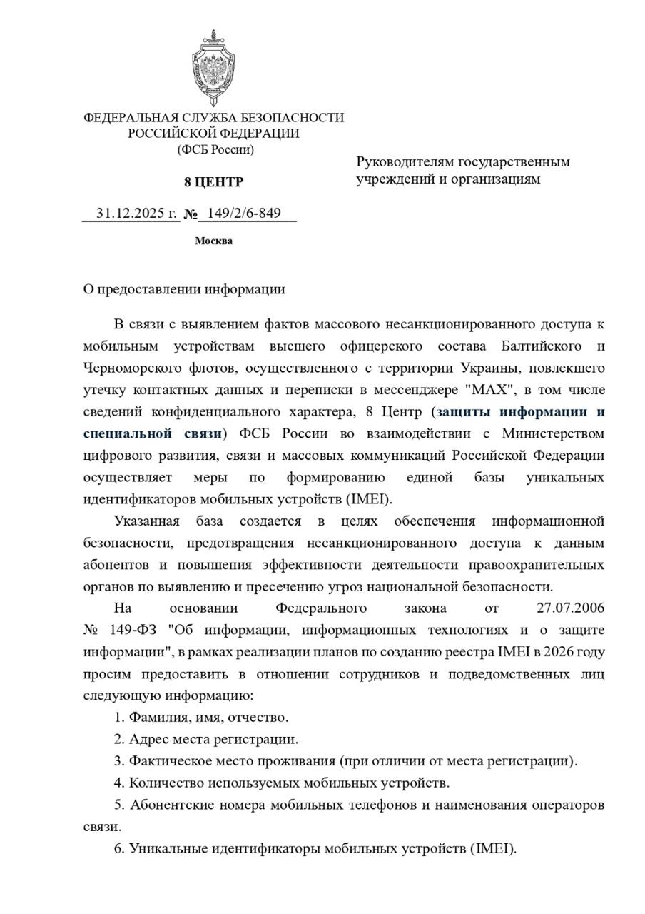 Повод действительно серьёзный. Недавно вскрылись массовые взломы мобильных устройств высшего офицерского состава Балтийского и Черноморского флотов. Атаки шли с территории Украины, привели к утечке контактов, переписки в мессенджере «МАХ» и, судя по всему, части конфиденциальной информации. Именно в ответ на это 8-й Центр ФСБ (защиты информации и специальной связи) совместно с Минцифры начал формировать ту самую базу IMEI. И процесс уже пошёл: госучреждениям и организациям разосланы требования предоставить полные данные на сотрудников и подведомственных лиц — ФИО, адреса регистрации и проживания, номера телефонов, операторов и, главное, все IMEI используемых устройств. Срок — до 15 января 2026 года.