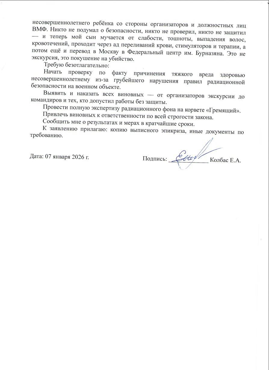 Мать Михаила обратилась в военную прокуратуру и следственный комитет с требованием провести тщательное расследование обстоятельств экскурсии и уровня радиационной безопасности на момент посещения корабля.