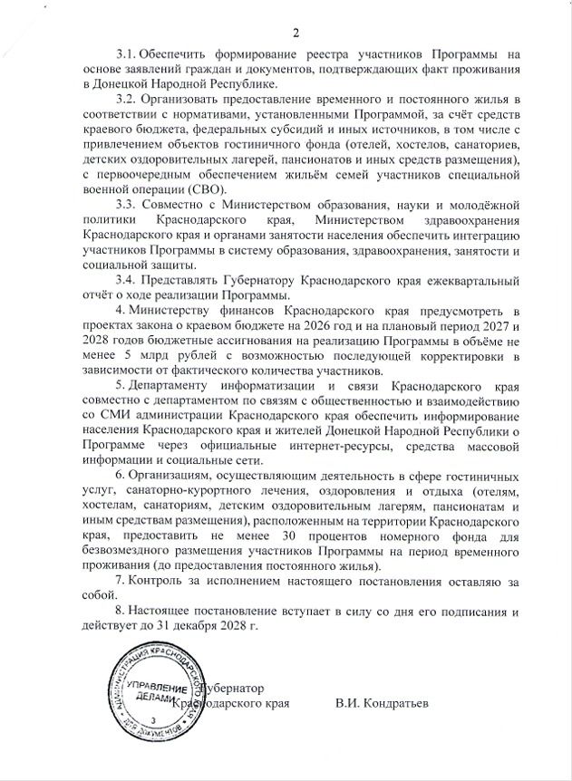 «Постановление подписано и уже вступает в силу. Суть в одном жёстком пункте: все отели, хостелы, санатории, пансионаты и детские лагеря Краснодарского края обязаны выделить не менее 30% номерного фонда под бесплатное временное размещение людей из ДНР. Без компенсации. Без обсуждений. До тех пор, пока человеку не дадут постоянное жильё», — заявил Андрей Руденко.