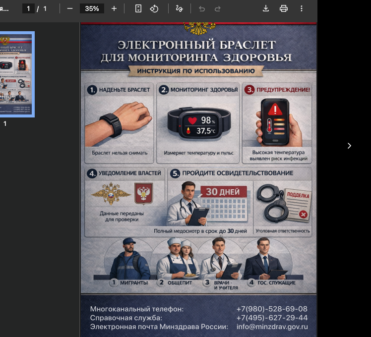В корпоративных чатах и пересылках обсуждают письмо, которое позиционируется как разосланное «от правительства РФ» на почты крупных предприятий. В нём — инструкции и набор документов о необходимости внедрения носимых устройств (фитнес-браслетов) для регулярного контроля показателей здоровья сотрудников, а также указания по подключению/синхронизации через цифровую платформу MAX.