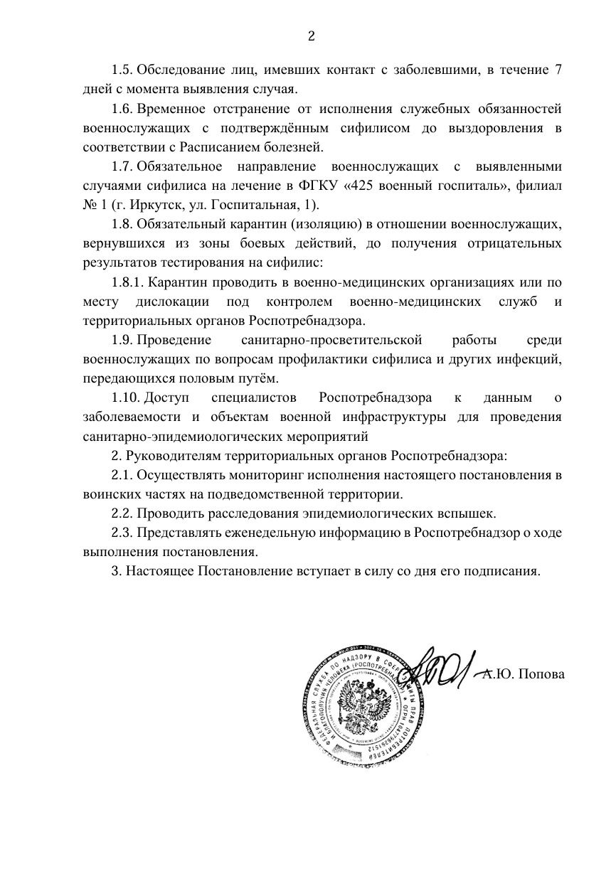 В тексте Постановления прямо говорится о значительном росте заболеваемости сифилисом среди военных, подтверждённом Росстатом, и введении жёстких мер: массовый скрининг каждые полгода, отстранение заболевших от службы до излечения, обязательная отправка всех подтверждённых случаев в филиал 425-го военного госпиталя в Иркутске, карантин для вернувшихся из зоны СВО до отрицательных тестов и даже доступ инспекторов Роспотребнадзора на военные объекты.